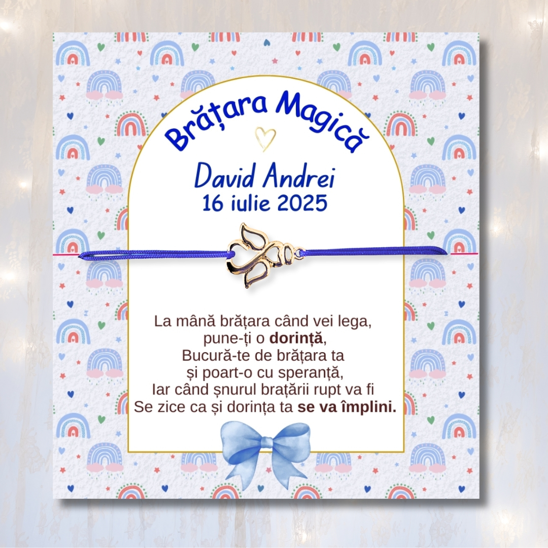 Transformă botezul băiețelului într-o amintire de poveste cu mărturii elegante și personalizate: o brățară magică cu șnur ajustabil (41 de culori, poliester imitație mătase) și cartonaș personalizat în nuanțe de albastru cu curcubee și accente aurii. Pe cartonaș este imprimat mesajul: