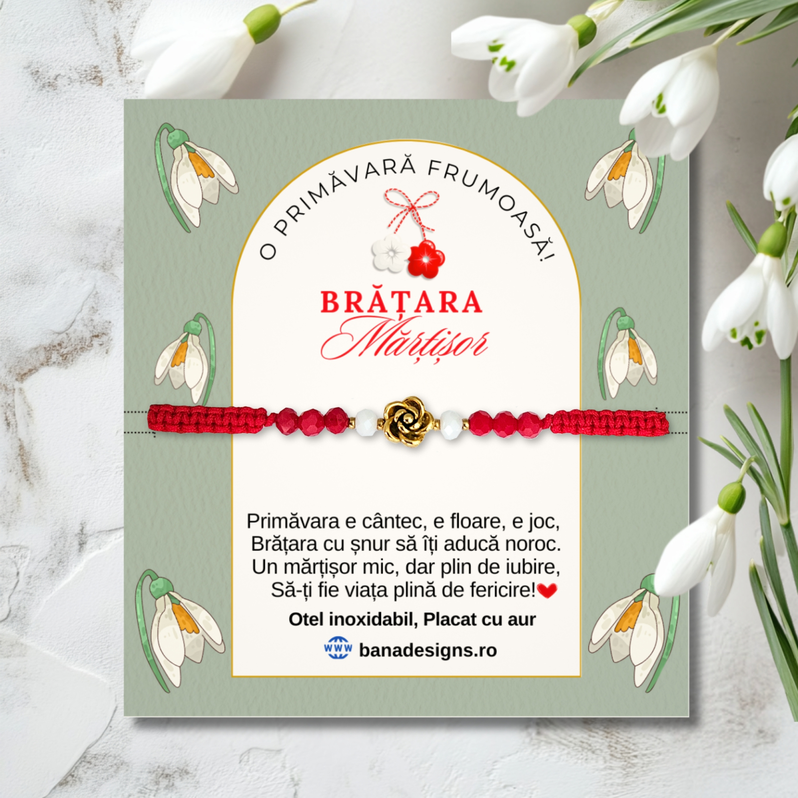 Bratara este montata pe snur macrame impletit manual, de culoare rosie, ajustabil, confortabil si potrivit pentru orice incheietura. Designul delicat imbina traditia Martisorului cu un stil modern si feminin, fiind un simbol al reinnoirii, iubirii si norocului.