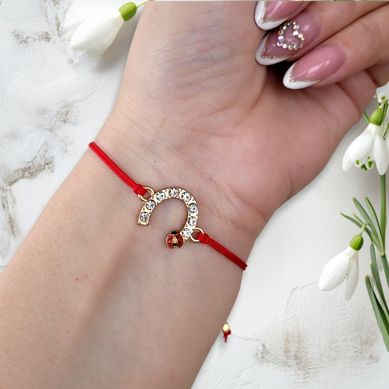 Bratara Martisor potcoava aurie cu buburuza si cristale, cu snur ajustabil de culoare rosie.
