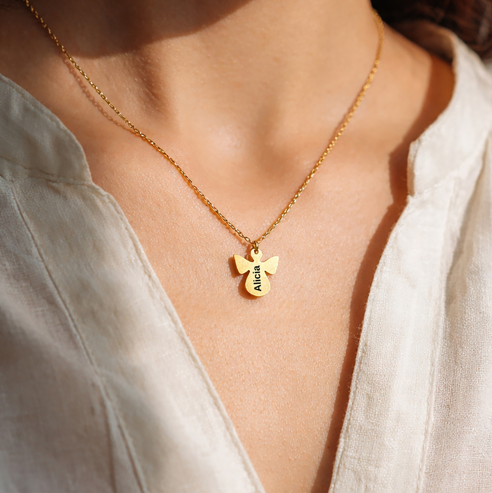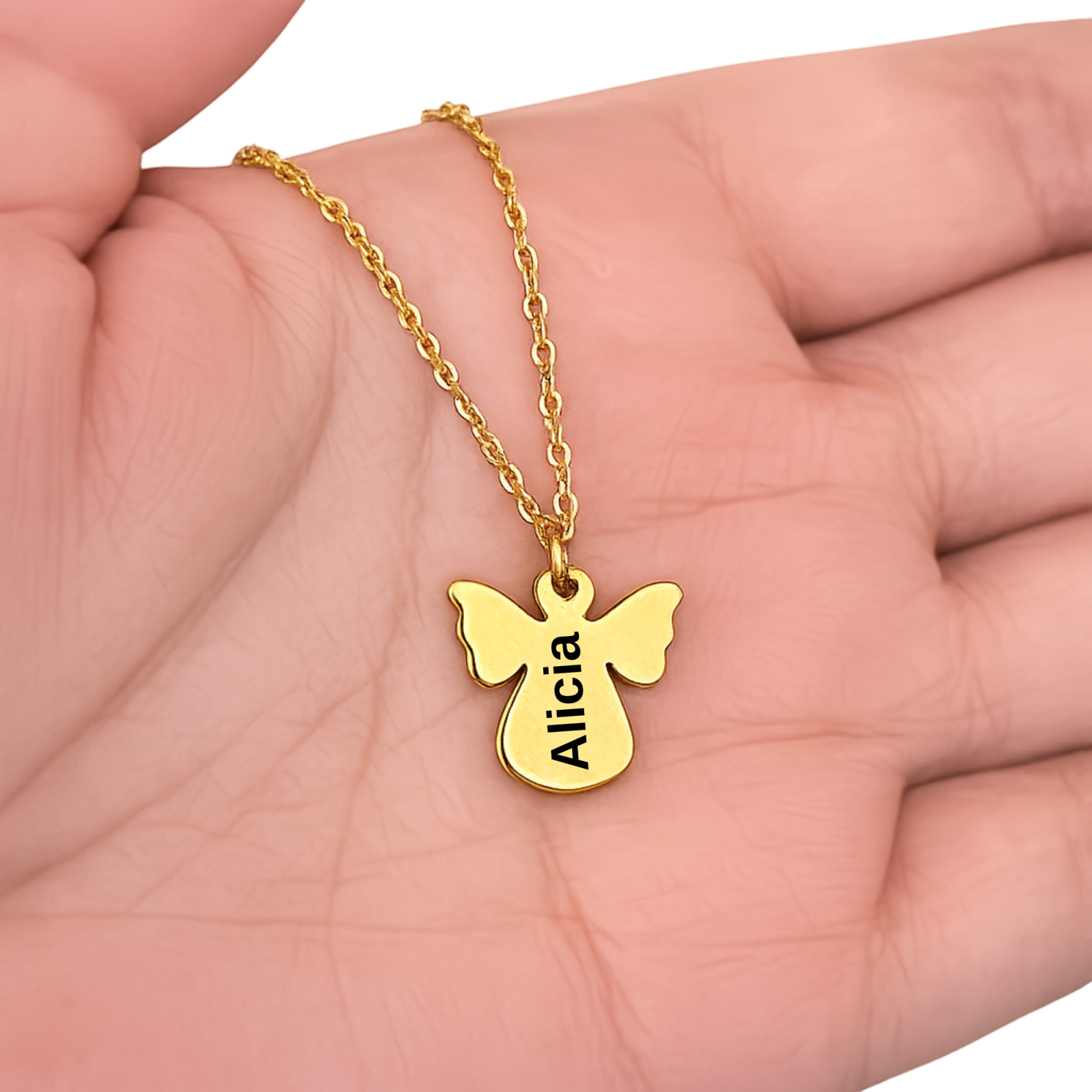 Poartă un simbol al protecției și al iubirii pure cu acest colier cu pandantiv în formă de înger, personalizat cu numele tău sau al unei persoane dragi.