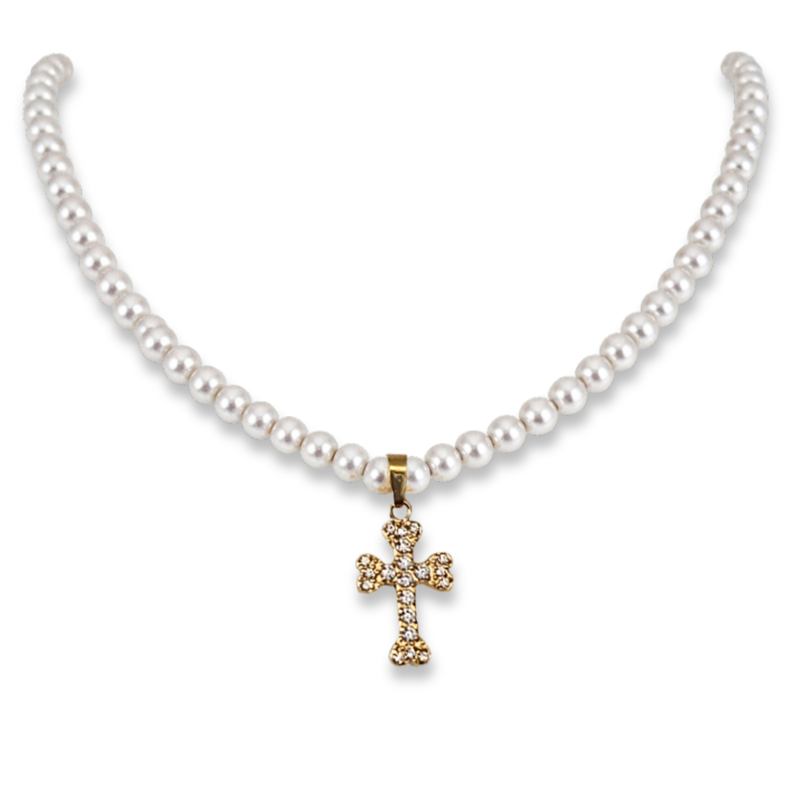 Colier din perle naturale shell albe, cu pandant cruce zirconia, inox auriu