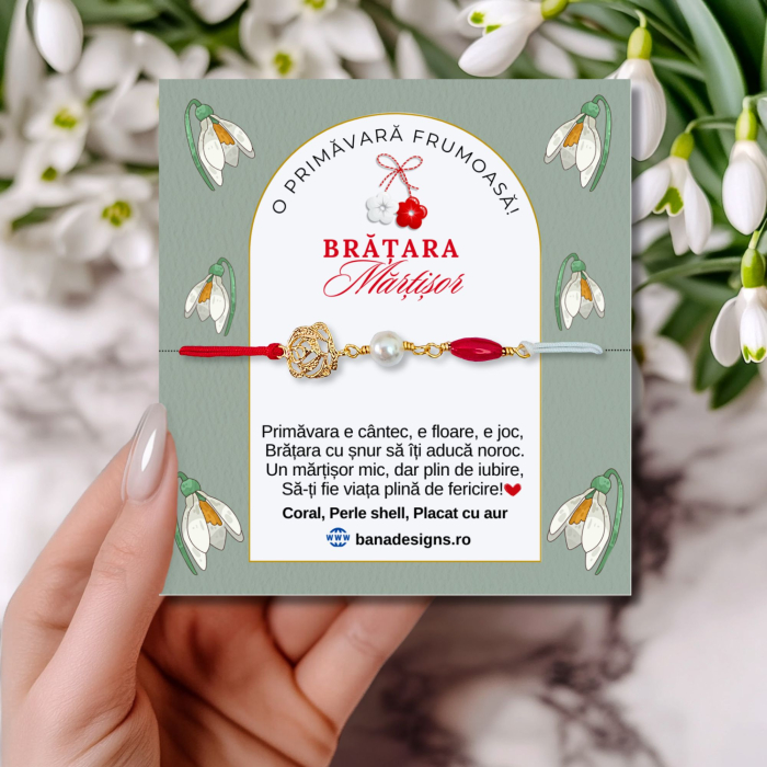 Brățara este ajustabilă și se închide ușor prin noduri glisante, fiind potrivită pentru orice dimensiune a încheieturii. Șnurul este din imitație de mătase, în culorile tradiționale de mărțișor, roșu și alb, pentru un plus de simbolism și eleganță.