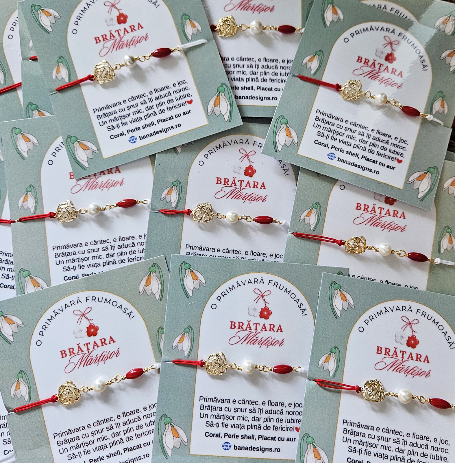 Fiecare brățară Mărțișor este ambalată cu grijă pe un cartonaș cu design de mărțișor, apoi introdusă într-o pungă transparentă, gata de oferit cadou unei persoane dragi.