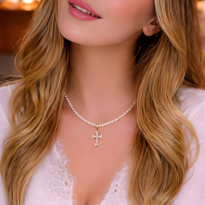 Elementele metalice sunt din inox IP auriu, rezistent la oxidare, oferind durabilitate și un aspect premium. Piesa centrală este un pandant în formă de cruce, decorat cu cristale cubic zirconia, care adaugă un plus de rafinament și eleganță.