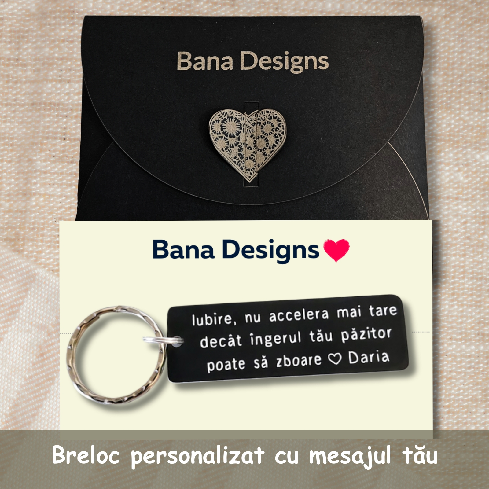 ✔ Breloc din aluminiu negru gravat laser cu mesajul „Iubire, nu accelera mai tare decât îngerul tău poate să zboare” – un simbol al iubirii și al grijii.